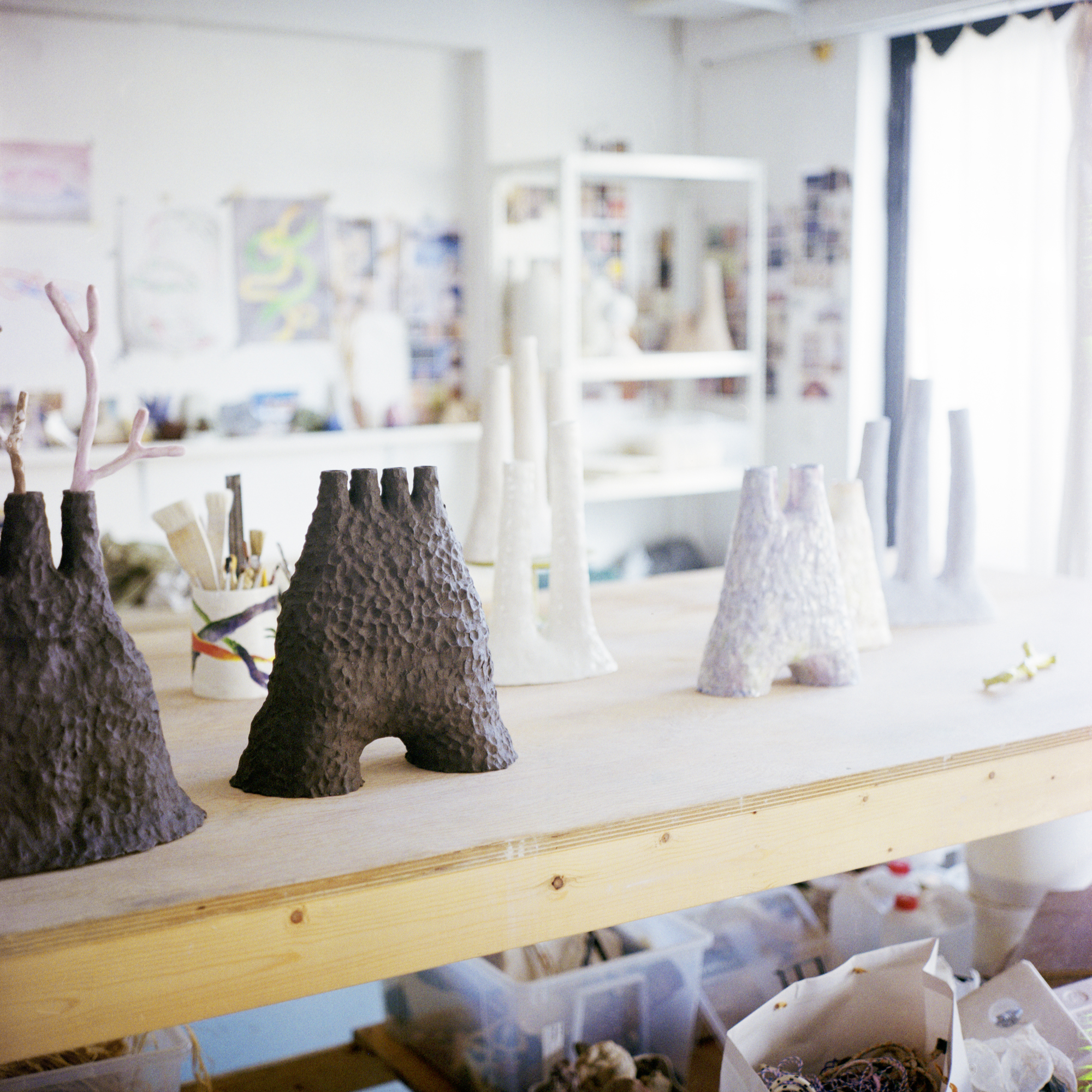 Camille Romagnani is a sculptor. Working freely between ceramics and beeswax, her scultures don’t ask for anything but our gaze, playing with color and shape, she creates lanscapes. Perfect worlds the viewer can loose itself in.